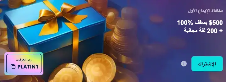 للحصول على باقة المكافأة الترحيبية، يجب عليك إدخال الرموز الترويجية PLATIN1 وPLATIN2 وPLATIN3 وPLATIN4. الحد الأدنى للإيداع للاستفادة من المكافأة هو 20 دولار.